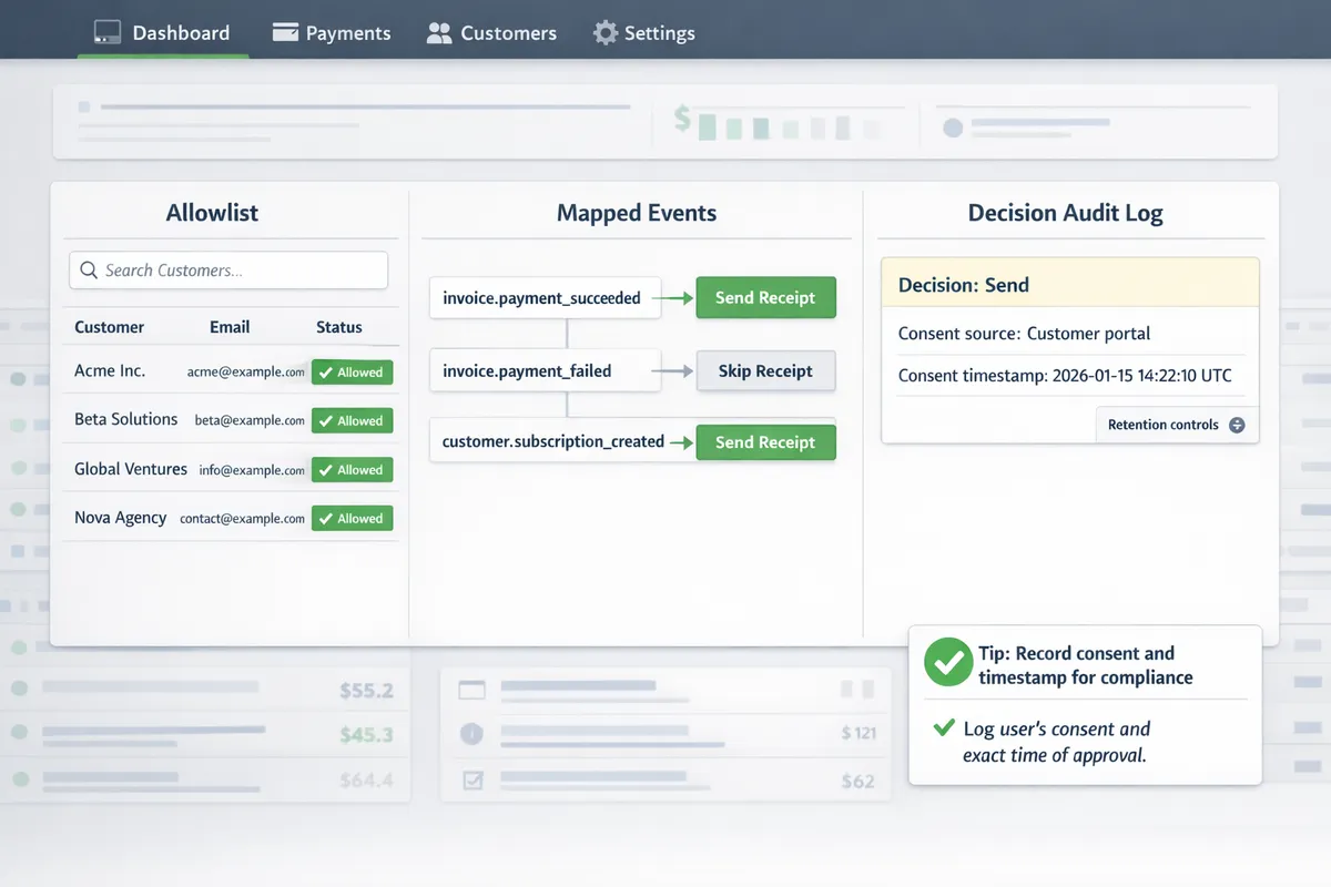 Automated Receipts in Stripe: Best Practices to Reduce Email Noise and Stay Compliant A single misrouted receipt can generate dozens of support emails and hours of compliance work. Automated receipts is a system that sends payment confirmations automatically while allowing selective delivery to specific customers and preserving an auditable decision log. This best-practices guide explains how to send automated receipts selectively in Stripe to reduce email noise and satisfy recordkeeping
